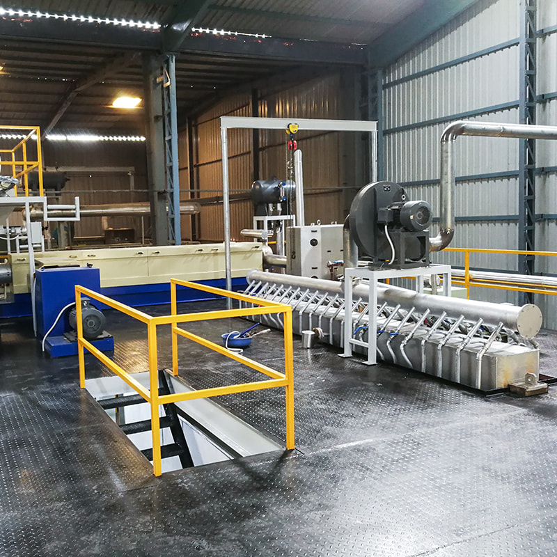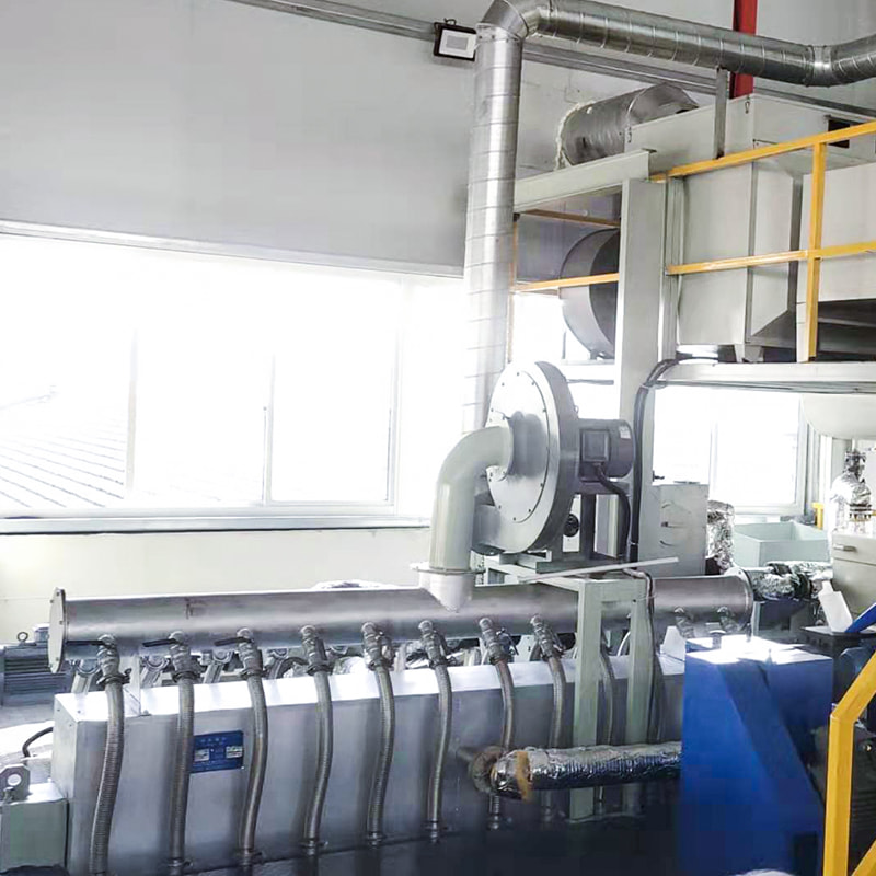 Extrusão e giro: os grânulos misturados, agora contendo os processos de extrusão e giro antioxidantes. O antioxidante se torna parte integrante dos filamentos fiados.