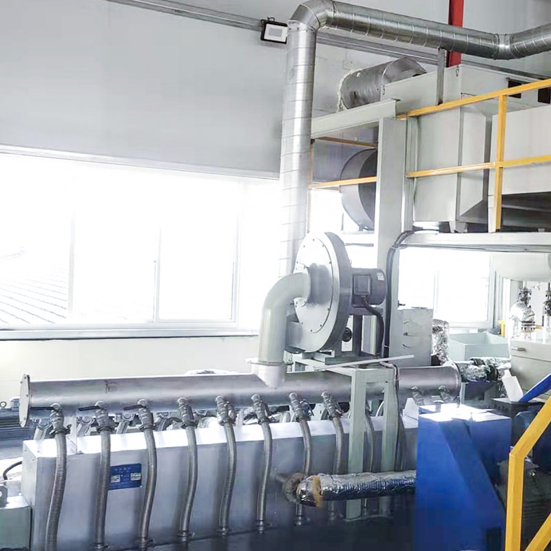Extrusão e giro: os grânulos misturados, agora contendo os processos de extrusão e giro antioxidantes. O antioxidante se torna parte integrante dos filamentos fiados.